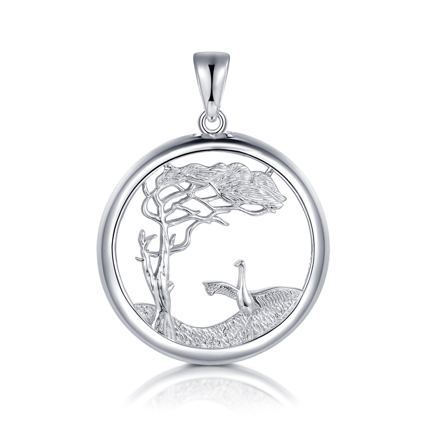 Dieser edle, runde Anhänger aus hochwertigem 925er-Sterlingsilber vereint nordische Naturmotive in filigraner Gestaltung. Im Mittelpunkt steht ein graziler Windflüchter – ein vom Wind geformter Küstenbaum, der symbolisch für Standhaftigkeit und die raue Schönheit des Nordens steht. Neben ihm erhebt sich ein majestätischer Kranich, Sinnbild für Freiheit, Glück und Erneuerung.