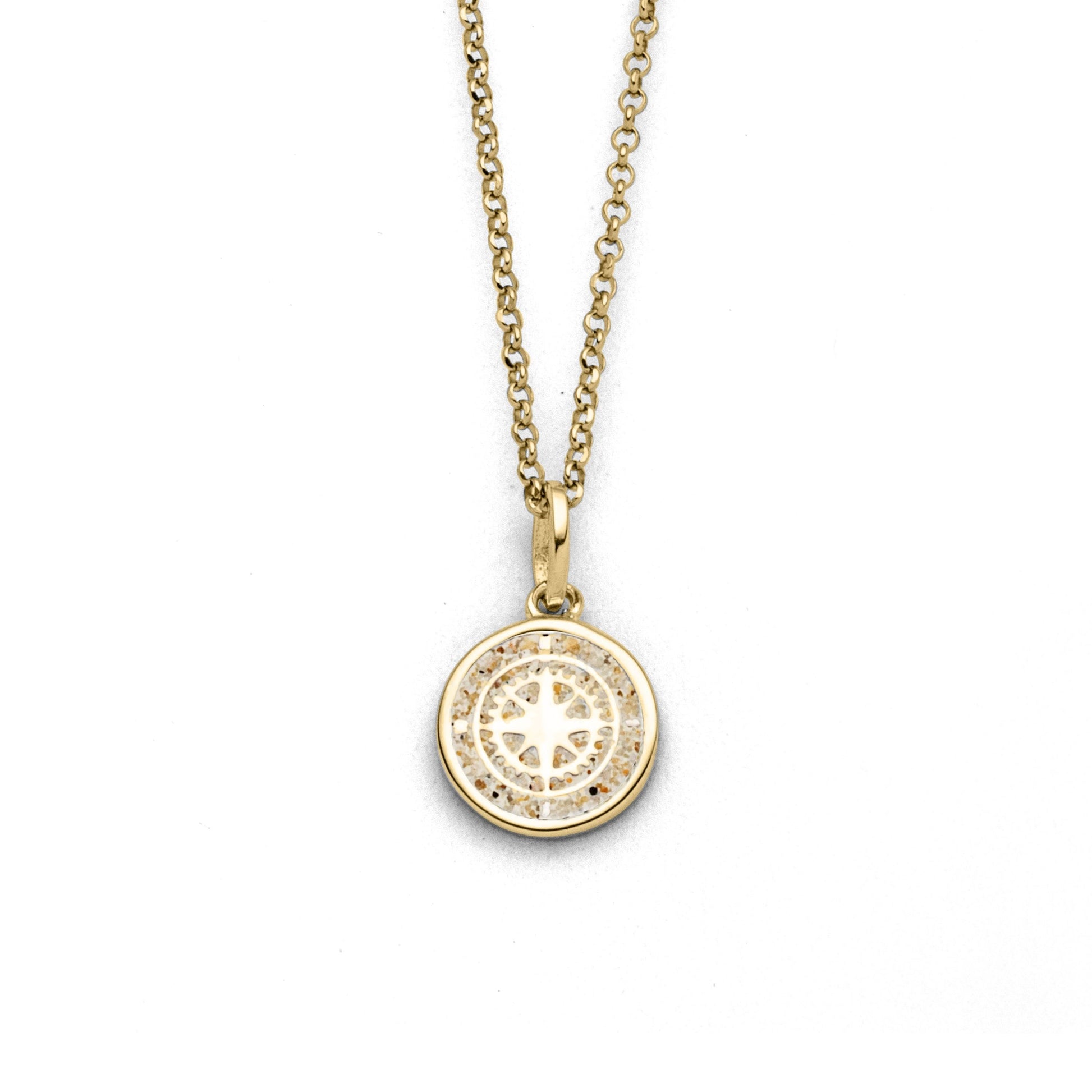 Feine vergoldete Erbskette an einem runden Anhänger mit einer in Strandsand gebetteten Kompassrose, aus poliertem, vergoldetem 925er Sterling-Silber, ca. 45 cm lang.
