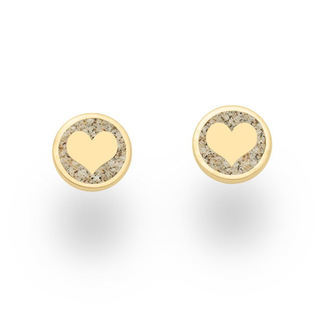 Ohrring „Herz“, kleiner runder Ohrstecker mit einem in Strandsand eingebetteten Herz, gefasst in vergoldetem 925er Sterlingsilber.
